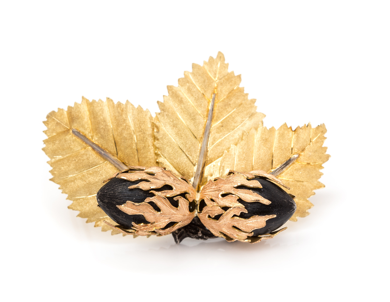 composed of three realistically textured yellow gold leaves with white gold stems surmounted with black rhodium plated "nuts" within openwork rose gold surrounds.Hand inscribed: Buccellati ITALY (partially obscured).Stamp: 750.