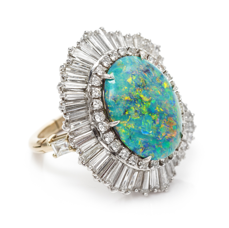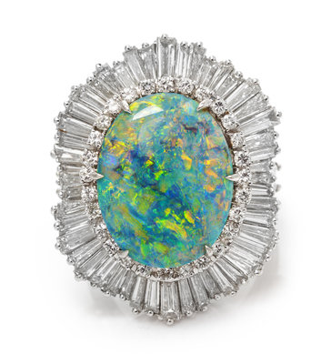 containing one oval cabochon cut grey base opal measuring approximately 19.04 x 14.75 x 5.33 mm, weighing approximately 8.48 carats, together with numerous round brilliant cut diamonds weighing approximately 0.60 carat total, 50 baguette and tapered baguette cut diamonds weighing approximately 4.50 carats total, stone set section can be detached and worn as pendant, later gold ring base with hinged bottom.