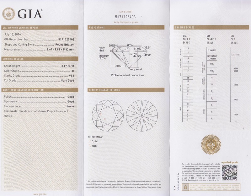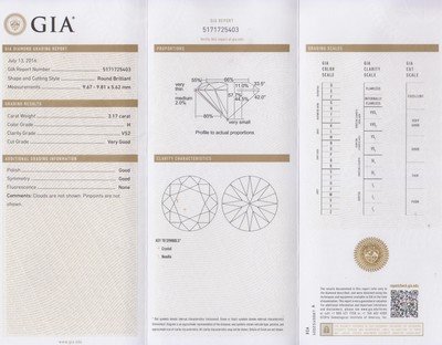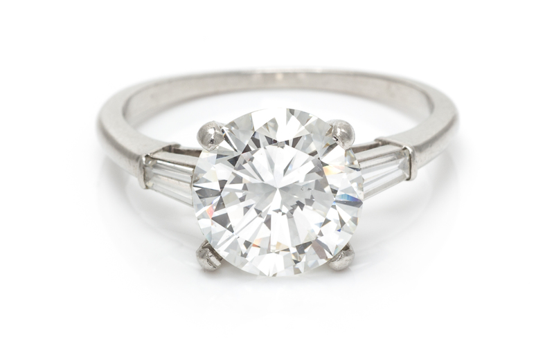 containing one round brilliant cut diamond weighing approximately 3.17 carats and two baguette cut diamonds weighing approximately 0.36 carat total.Stamp: 10%IRID PLAT.Accompanied by a Gemological Institute of America diamond grading certificate number 5171725403, dated July 13, 2016, stating Weight: 3.17 carats, Color: H, Clarity: VS2, Cut: Very Good, Polish: Good, Symmetry: Good, Fluorescence: None.