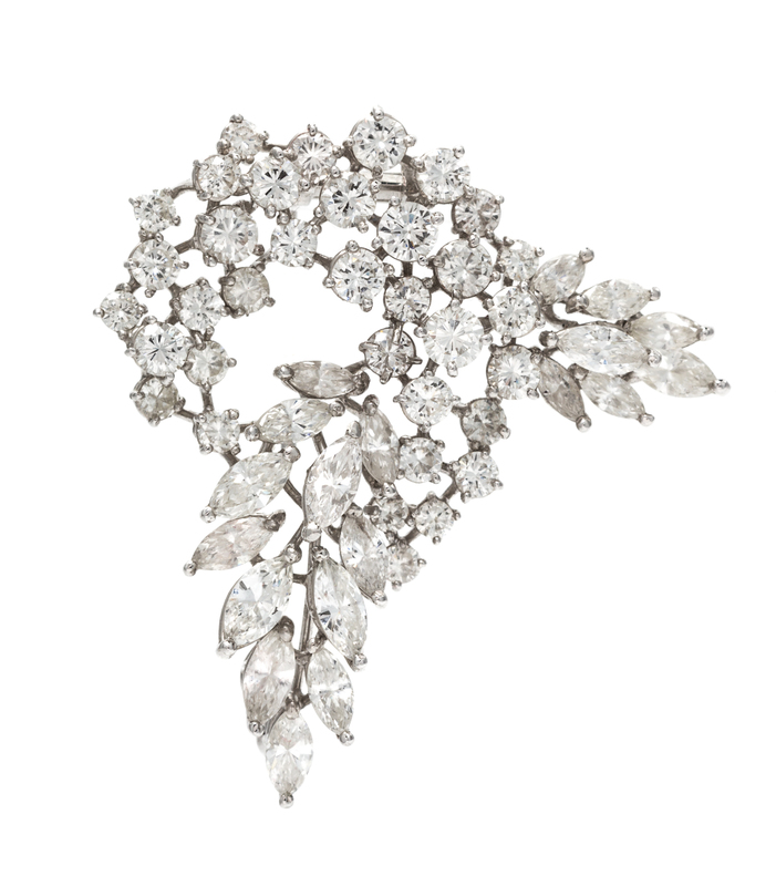 in an openwork spray design, containing 33 round brilliant cut diamonds weighing approximately 3.52 carats total and 19 marquise cut diamonds weighing approximately 2.43 carats total.Stamp: (Partially obscured) 23587.
