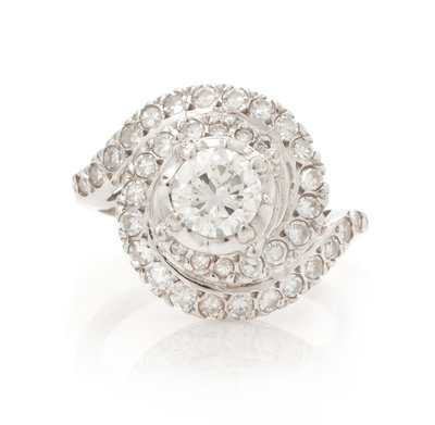 containing one round brilliant cut diamond weighing approximately 0.81 carat and 38 round single cut diamonds weighing approximately 0.76 carat total.Stamp: 14K (maker's mark).