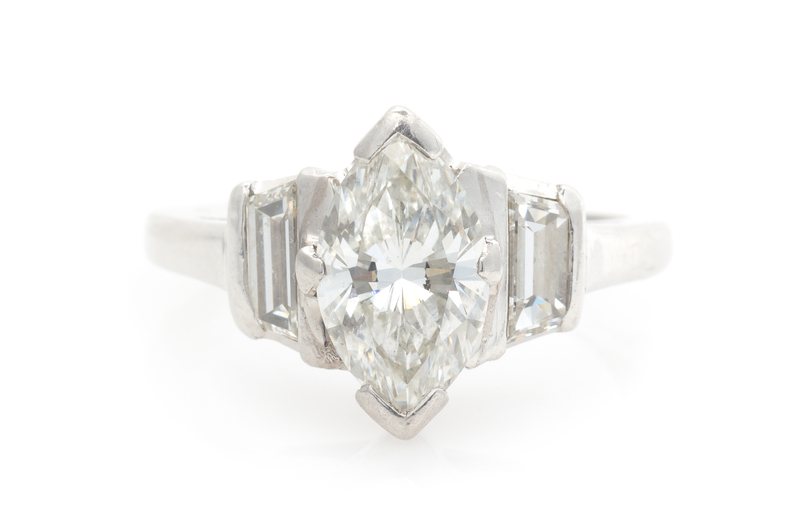 containing one marquise cut diamond weighing approximately 1.41 carats and two trapezoid shape step cut diamonds weighing approximately 0.56 carat total.Stamp: 10%IRID.PL.