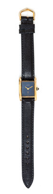 21.00 x 20.00 case dimensions excluding lugs, blue dial signed must de Cartier, gold tapered sword hands, synthetic sapphire set crown, manual wound mechanical movement, black strap signed Cartier, gold tone buckle.