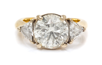 containing one round brilliant cut diamond weighing approximately 3.46 carats and two triangular brilliant cut diamonds weighing approximately 1.04 carats total.Stamp: 14K.