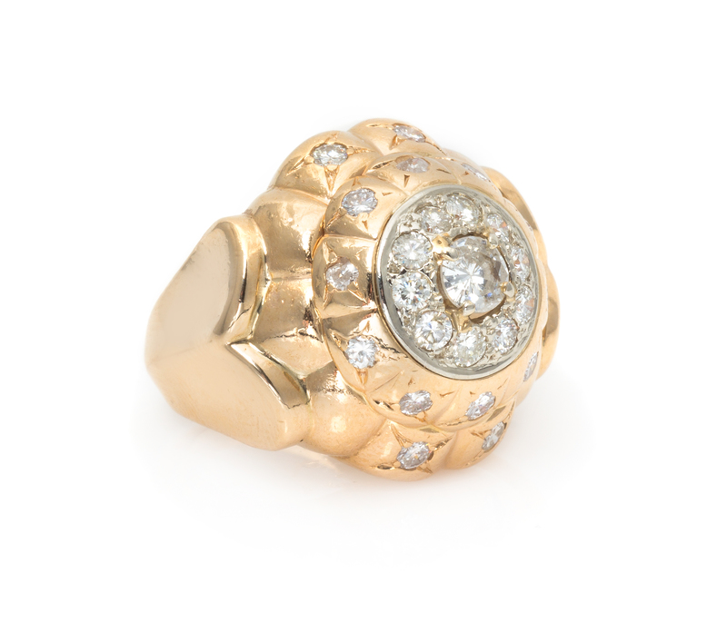 containing one round brilliant cut diamond weighing approximately 0.50 carat and 24 round brilliant cut diamonds weighing approximately 0.62 carat total.Stamp: 14K.