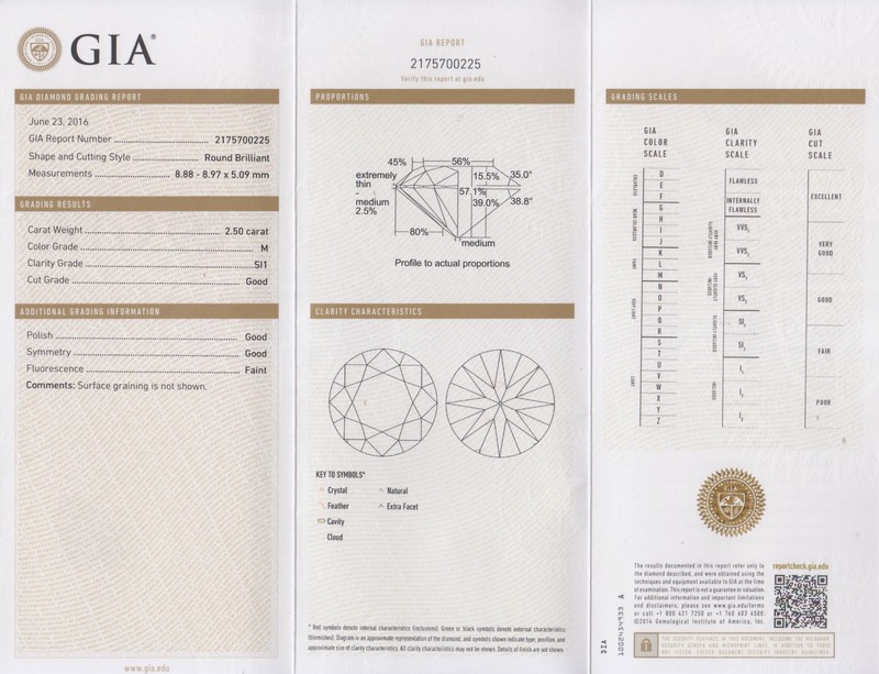 in a modernist design, consisting of a central curvilinear section containing one round brilliant cut diamond weighing approximately 2.50 carats.Stamp: (maker's mark) 14K.Accompanied by a Gemological Institute of America diamond grading certificate number 2175700225, dated June 23, 2016, stating Color: M, Clarity: SI1, Cut: Good Polish: Good, Symmetry: Good, Fluorescence: Faint.