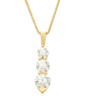 containing one round brilliant cut diamond weighing approximately 0.43 carat, one round brilliant cut diamond weighing approximately 0.70 carat, and one round brilliant cut diamond weighing approximately 1.07 carats, suspended from an 18 karat yellow gold wheat chain necklace.Stamp: HoF Co. 750.