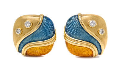 A Pair of 18 Karat Yellow Gold, Diamond and Polychrome Enamel Earclips, de Vroomen,