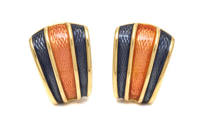 A Pair of 18 Karat Yellow Gold and Polychrome Enamel Earclips, de Vroomen,