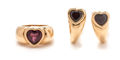 consisting of a ring containing one heart shape mixed cut garnet together with a pair of earclips containing two heart shape mixed cut garnets.Ring stamp: A87049 PIAGET 1996 56 750.Earring stamp: 750.