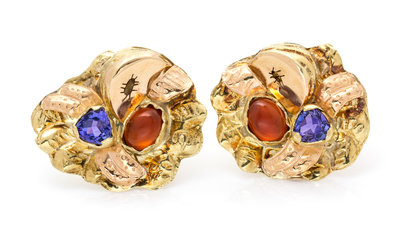 A Pair of 18 Karat Bicolor Gold, Tanzanite and Hessonite Earclips, Margaret Barnaby,