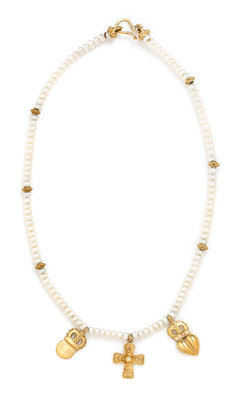 consisting of a crown and heart motif pendant with a matte finish containing four round brilliant cut diamonds, a cross pendant with a matte finished containing one round brilliant cut diamond, and one crown monogrammed pendant with a matte finish suspended from a necklace containing numerous pearls measuring approximately 4.17-4.34 mm in diameter strung knotted with an 18 karat gold hook and eye clasp.Stamp: 18K.