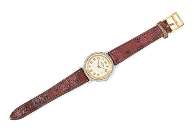 29.00 mm case diameter, cream dial signed HERMES, Arabic numerals, date aperture at 3 o'clock, pencil hands, snap on case back, quartz movement, two-tone polished circular case, brown ostrich strap, gold tone tang buckle.