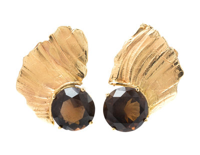 A Pair of 14 Karat Yellow Gold and Smokey Quartz Earclips, Eve Alfille,
