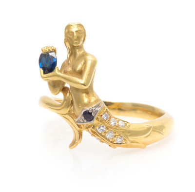 An 18 Karat Yellow Gold, Diamond and Sapphire Mermaid Motif Ring, Carrera y Carrera,