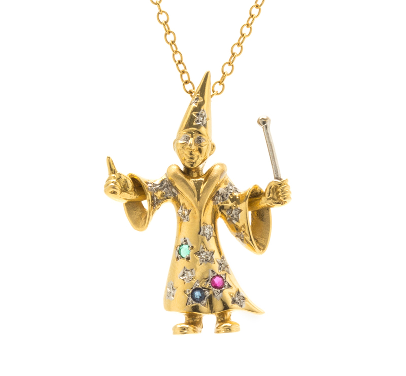 An 18 Karat Yellow Gold, Diamond, Ruby, Sapphire, and Emerald Articulated Wizard Pendant, Wempe,