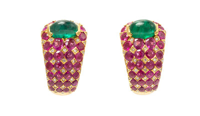 containing two oval cabochon cut emeralds weighing approximately 6.00 carats total, 64 round and oval mixed cut rubies weighing approximately 11.00 carats, and 72 round brilliant cut diamonds weighing approximately 0.80 carat total.Stamp: 750 (maker's mark for Elan).
