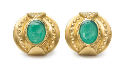 A Pair of 18 Karat Yellow Gold, Diamond and Glass Intaglio Earclips,