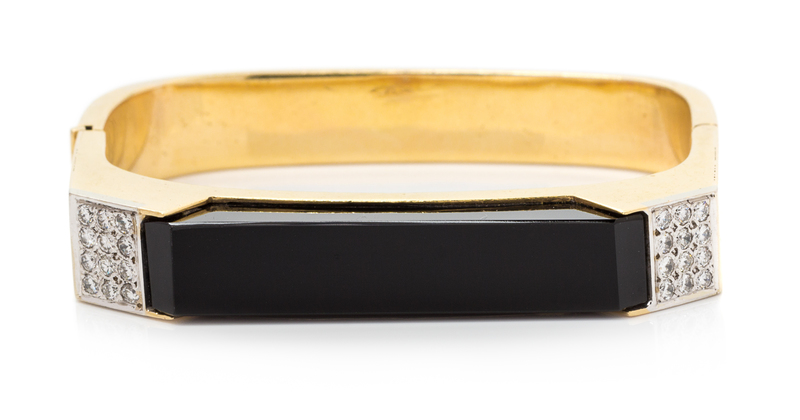 A Yellow Gold, Onyx and Diamond Bangle Bracelet,