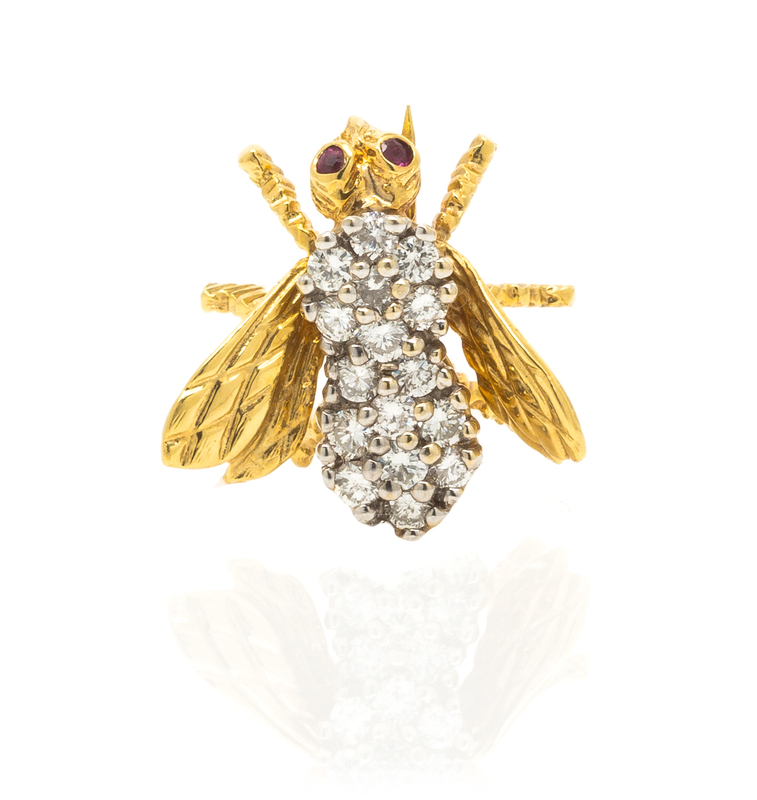 An 18 Karat Yellow Gold, White Gold, Diamond and Ruby Bee Brooch, Herbert Rosenthal,