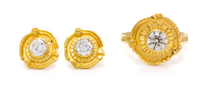 consisting of a ring containing one old European cut diamond weighing approximately 0.70 carat together with a pair of matching 22 karat yellow gold earrings of similar style containing two old European cut diamonds weighing approximately 0.98 carat total.Earring stamp: 22K RRC.