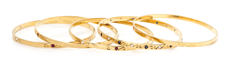A Collection of 18 Karat Yellow Gold, Diamond, Ruby and Sapphire Bangle Bracelets,