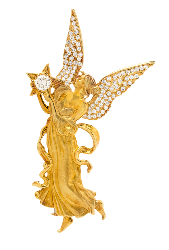 An 18 Karat Yellow Gold and Diamond Angel Motif Pendant/Brooch,