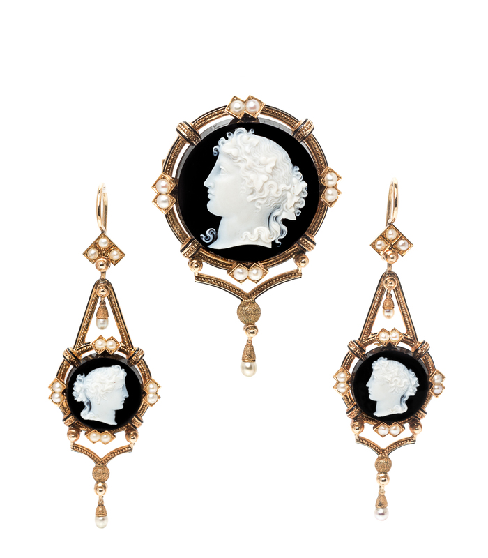 A Victorian Yellow Gold, Sardonyx Cameo, and Pearl Demi Parure,