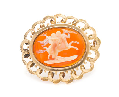consisting of an oval carved agate cameo depicting the abduction of Deianira by Nessus, bezel set within open scalloped design.Engraved: Michelini Ao 12.