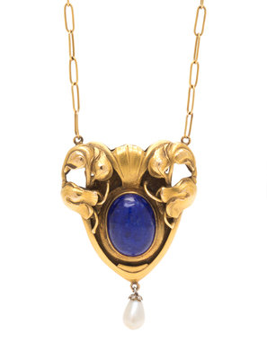 An Arts and Crafts Yellow Gold, Lapis Lazuli and Pearl Necklace, Kalo,