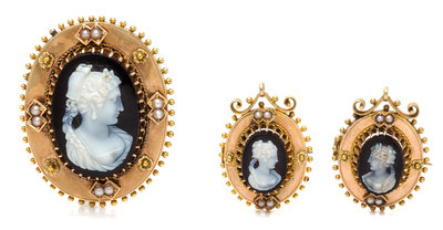 consisting of a pendant/brooch containing one oval carved onyx cameo depicting a female profile in period dress in white against a black background, the frame accented with granulation, applied florets and eight seed pearls (origin not tested), together with two matching smaller brooches (converted from earpendants) containing oval carved onyx cameos depicting a female profile in period dress in white against a black background, the framed accented with granulation, applied florets and eight seed pearls (origin not tested).