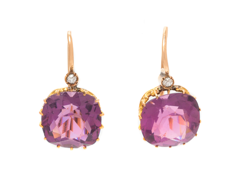 containing two antique cushion cut purple glass measuring approximately 11.30 x 11.30 mm and two old mine cut diamonds weighing approximately 0.06 carat total.