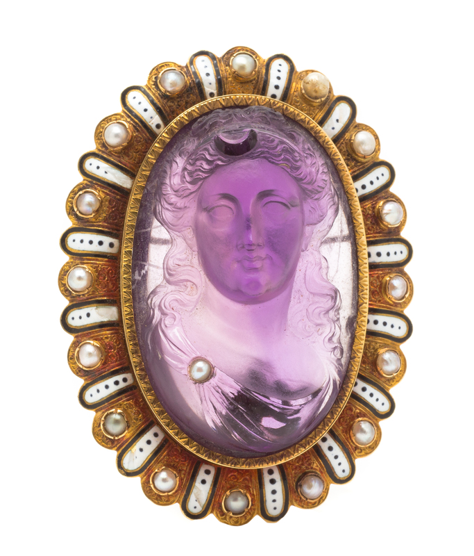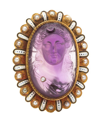 composed of a central carved amethyst depicting a Diana wearing a crescent moon in her tresses and a pearl on her sash, the cameo measuring approximately 26.00 x 41.00 mm and set within an engraved edge bezel, the intricate outer scalloped border accented with black and white enamel and seed pearls (origin not tested).