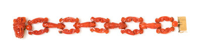 consisting of carved red orange coral links in dog and scrollwork motifs accented with gold studs and joined with a clasp containing a red orange coral cameo depicting Bacchus.Stamp: 750 (maker's mark).