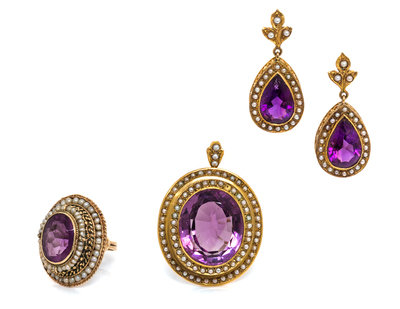 consisting of a pendant/brooch containing one oval mixed cut amethyst measuring approximately 23.40 x 20.30 x 12.32 mm and numerous seed pearls, pair of earrings containing two pear mixed cut amethysts measuring approximately 16.62 x 11.02 x 6.99 mm and numerous seed pearls together with a 14 karat gold ring containing one oval mixed cut amethyst measuring approximately 15.15 x 11.45 mm and numerous seed pearls.