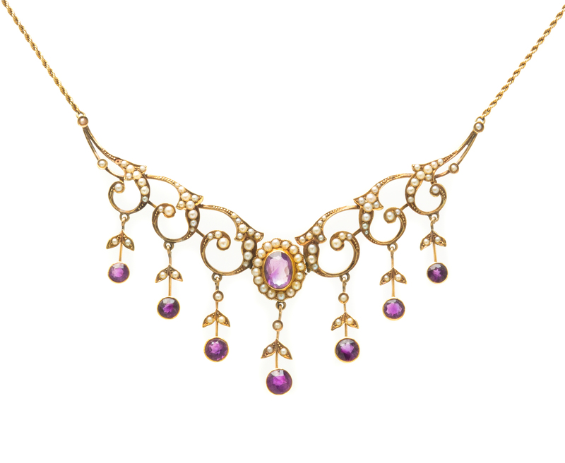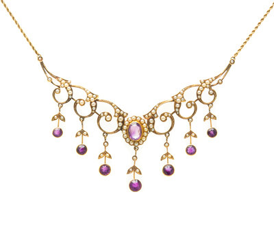An Edwardian 14 Karat Yellow Gold, Amethyst and Pearl Fringe Necklace,