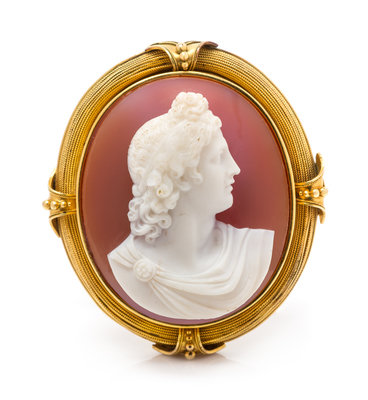 An Etruscan Revival Yellow Gold and Agate Cameo Pendant/Brooch,
