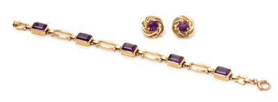 consisting of a retro bracelet in a fluted and polished link design containing five octagonal step cut amethyst weighing approximately 2.71 carats total, together with a pair of knot motif earrings containing two round mixed cut amethyst measuring approximately 7.15 mm in diameter.