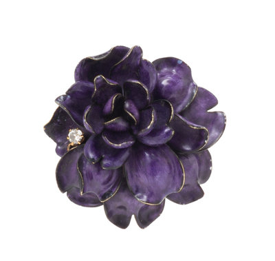 containing one old mine cut diamond weighing approximately 0.12 carat, the multi-petal design accented with opaque purple enamel.Stamp: (maker's mark) 01325 14K.