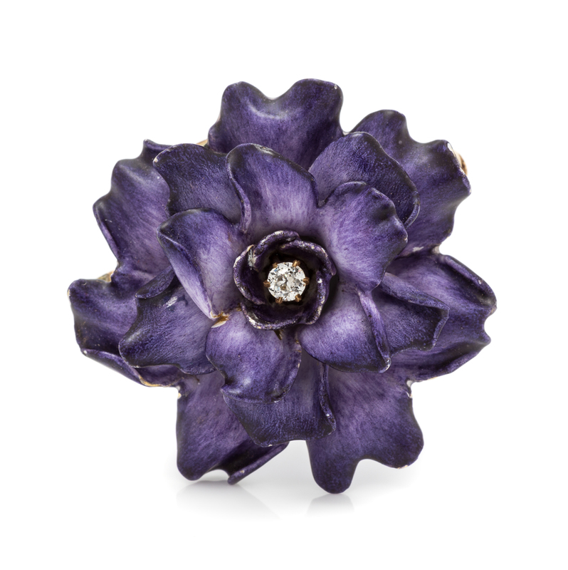 containing one round brilliant cut diamond weighing approximately 0.06 carat, the multilayered petal design accented with opaque purple enamel.Stamp: 14K H (maker's mark).