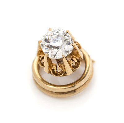 containing one old mine cut diamond weighing approximately 0.46 carat within a buttercup setting above the spiralled pin back.Accompanied by a fitted case.
