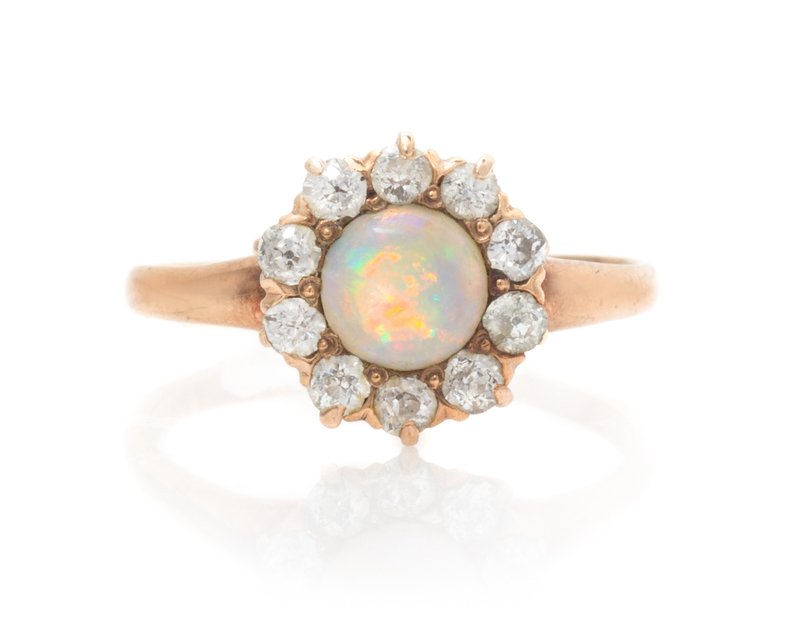 containing one round cabochon cut opal measuring approximately 5.40 mm in diameter and 10 old mine cut diamonds.