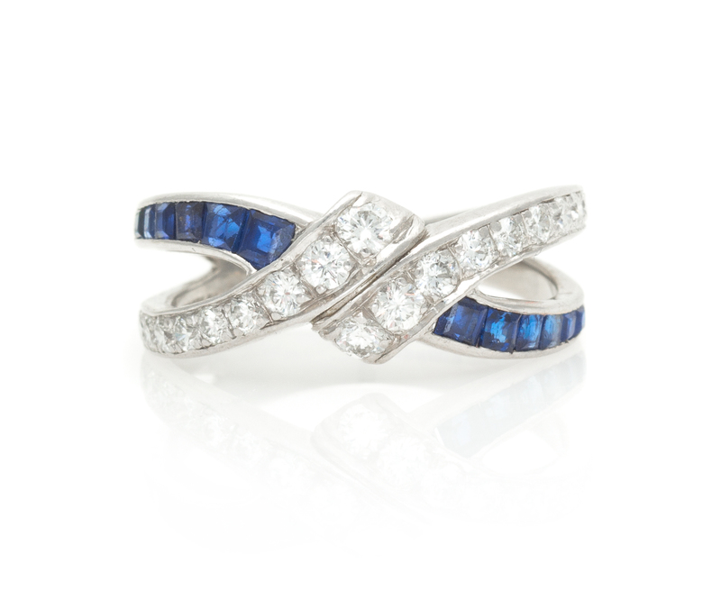 containing 12 square step cut sapphires and 18 round brilliant cut diamonds.Stamp: 10%IRIDPLAT.