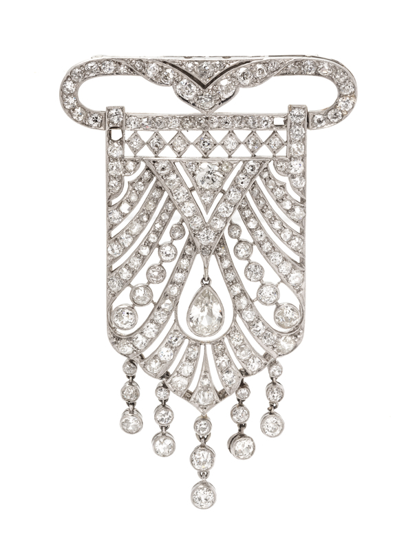 in an openwork design with hinged top section, the base with accented with five articulated pendants, the brooch containing one antique pear shape diamond weighing approximately 0.70 carat and numerous old European, old mine, and rose cut diamonds weighing approximately 6.35 carats total.