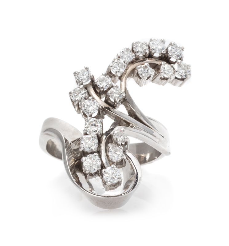 in a swirl design, containing 19 round brilliant cut diamonds weighing approximately 1.24 carats total.