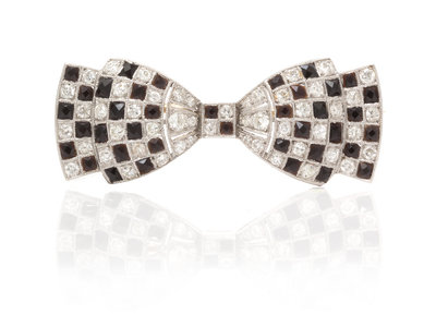 An Art Deco Platinum, Diamond and Onyx Bow Brooch,