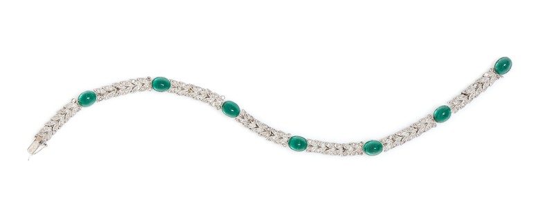 An Art Deco Platinum, Green Glass and Diamond Bracelet,