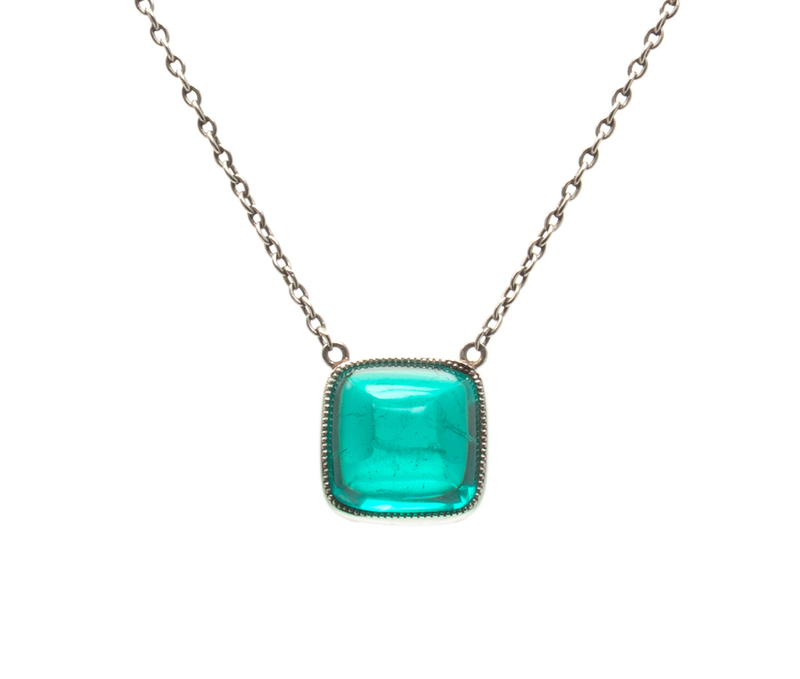 containing one square cabochon cut green glass together suspended from a curb link chain, the clasp containing one round brilliant cut diamond on the clasp.