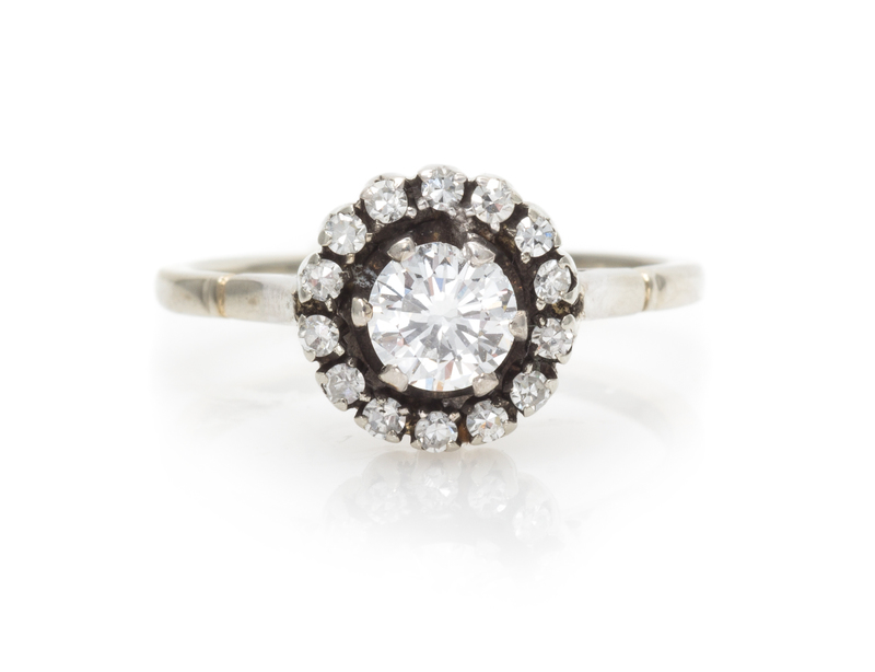containing one round brilliant cut diamond weighing approximately 0.46 carat total and 14 round single cut diamonds weighing approximately 0.21 carat total.