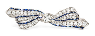 An Art Deco Platinum, Diamond and Synthetic Sapphire Bow Brooch,